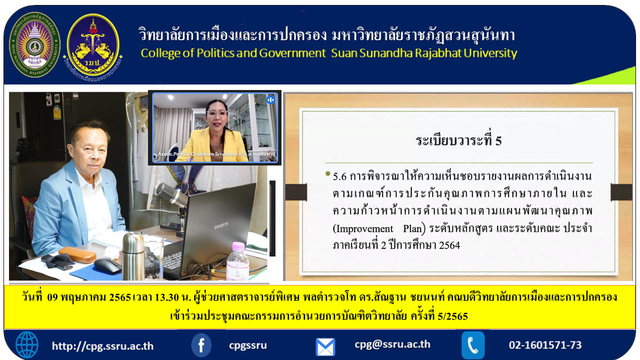 วันที่ 09 พฤษภาคม 2565 เวลา 13.30 น. ผู้ช่วยศาสตราจารย์พิเศษ พลตำรวจโท ดร.สัณฐาน ชยนนท์ คณบดีวิทยาลัยการเมืองและการปกครอง เข้าร่วมประชุมคณะกรรมการอำนวยการบัณฑิตวิทยาลัย ครั้งที่ 5/2565 โดยมี รองศาสตราจารย์ ดร.ชุติกาญจน์ ศรีวิบูลย์ อธิการบดี เป็นประธานในการประชุม พร้อมด้วยผู้บริหารของมหาวิทยาลัย ในรูปแบบออนไลน์ผ่าน Google meet