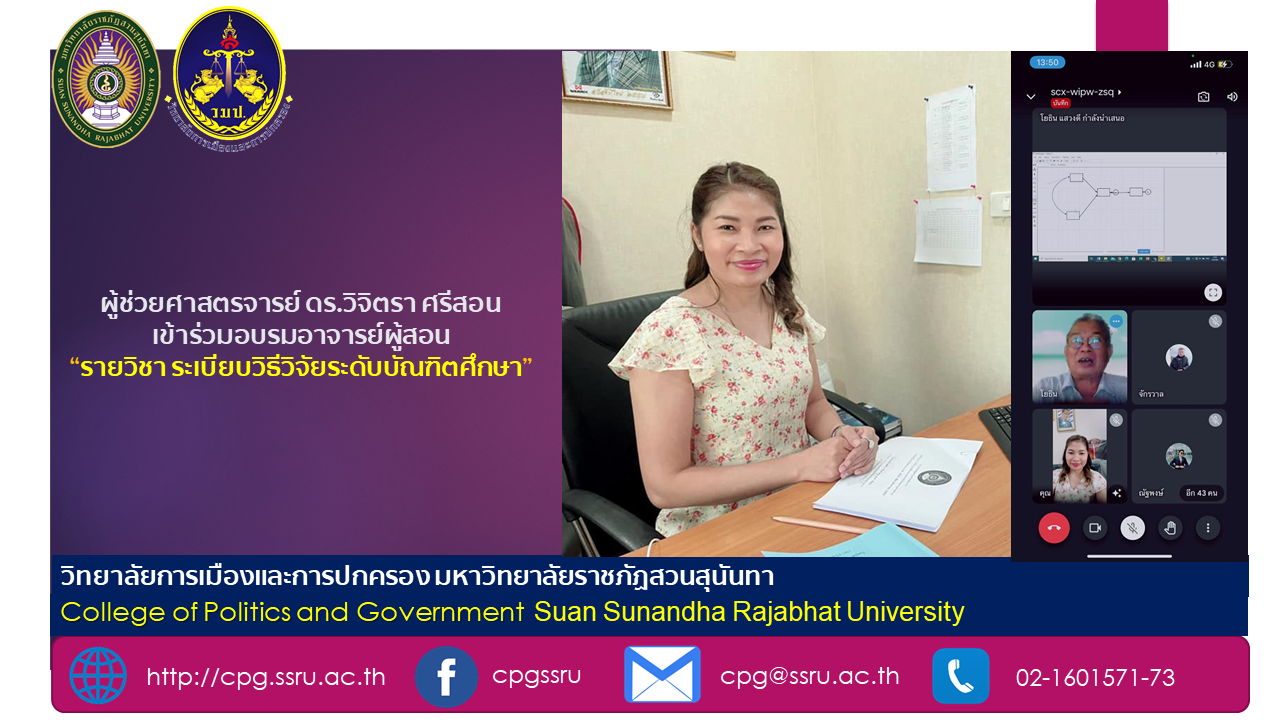 เมื่อวันที่ 5-6 สิงหาคม 2564 ผู้ช่วยศาสตรจารย์ ดร.วิจิตรา ศรีสอน ได้เข้าร่วมอบรมอาจารย์ผู้สอนในรายวิชา ระเบียบวิธีวิจัยระดับบัณฑิตศึกษาเพื่อจัดการเรียนการสอนให้เป็นไปในทิศทางเดียวกันตามนโยบายทางมหาวิทยาลัยราชภัฏสวนสุนันทา ซึ่งอบรมออนไลน์ผ่าน Google Meet โดย รองศาสตรจารย์ ดร.โยธิน แสวงดี เป็นผู้บรรยาย