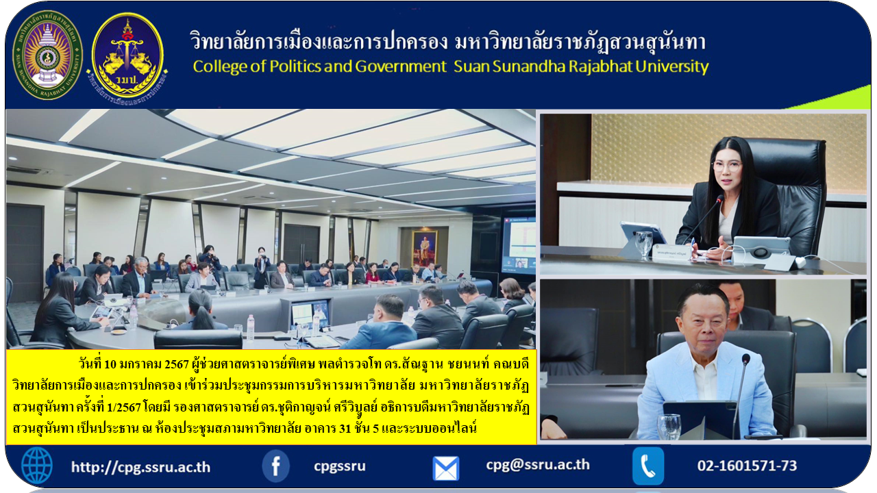 วันที่ 10 มกราคม 2567 ผู้ช่วยศาสตราจารย์พิเศษ พลตำรวจโท ดร.สัณฐาน ชยนนท์ คณบดีวิทยาลัยการเมืองและการปกครอง เข้าร่วมประชุมกรรมการบริหารมหาวิทยาลัย มหาวิทยาลัยราชภัฏสวนสุนันทา ครั้งที่ 1/2567 โดยมี รองศาสตราจารย์ ดร.ชุติกาญจน์ ศรีวิบูลย์ อธิการบดีมหาวิทยาลัยราชภัฏสวนสุนันทา เป็นประธาน ณ ห้องประชุมสภามหาวิทยาลัย อาคาร 31 ชั้น 5 และระบบออนไลน์