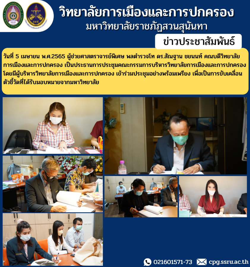 วันที่ 5 เมษายน พ.ศ. 2565 ผู้ช่วยศาสตราจารย์พิเศษ พลตำรวจโท ดร.สัณฐาน ชยนนท์ คณบดีวิทยาลัยการเมืองและการปกครอง เป็นประธานการประชุมคณะกรรมการบริหารวิทยาลัยการเมืองและการปกครอง โดยมีผู้บริหารวิทยาลัยการเมืองและการปกครอง เข้าร่วมประชุมอย่างพร้อมเพรียง เพื่อเป็นการขับเคลื่อนตัวชี้วัดที่ได้รับมอบหมายจากมหาวิทยาลัย
