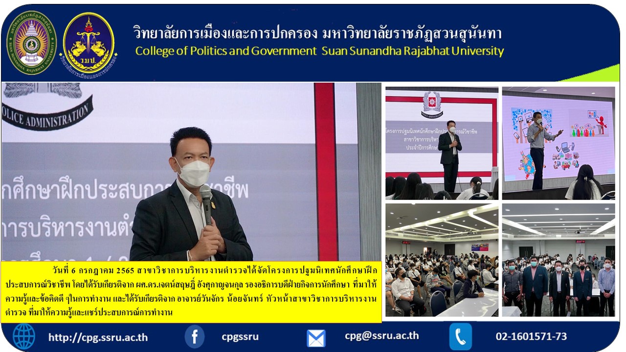 วันที่ 6 กรกฎาคม 2565 สาขาวิชาการบริหารงานตำรวจได้จัดโครงการปฐมนิเทศนักศึกษาฝึกประสบการณ์วิชาชีพ โดยได้รับเกียรติจาก ผศ.ดร.เจตน์สฤษฎิ์ อังศุกาญจนกุล รองอธิการบดีฝ่ายกิจการนักศึกษา ที่มาให้ความรู้และข้อคิดดี ๆในการทำงาน และได้รับเกียรติจาก อาจารย์วันจักร น้อยจันทร์ หัวหน้าสาขาวิชาการบริหารงานตำรวจ ที่มาให้ความรู้และแชร์ประสบการณ์การทำงาน นอกจากนี้ยังได้รับเกียรติจากคุณอรรถสิทธิ์ นิกรวัฒน์ เป็นวิทยากรในการบรรยายเกี่ยวกับการเตรียมความพร้อมสำหรับการฝึกประสบการณ์วิชาชีพ