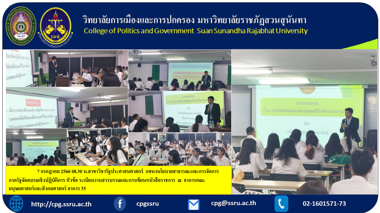 7 กรกฎาคม 2566 08.30 น.สาขาวิชารัฐประศาสนศาสตร์ แขนงนโยบายสาธารณะและการจัดการภาครัฐจัดอบรมเชิงปฏิบัติการ หัวข้อ ระเบียบงานสารบรรณและการเขียนหนังสือราชการ ณ อาคารคณะมนุษยศาสตร์และสังคมศาสตร์ อาคาร 35