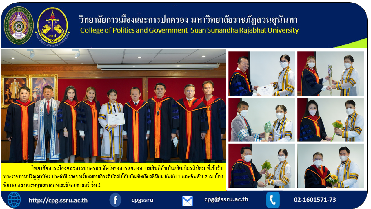 วิทยาลัยการเมืองและการปกครอง จัดโครงการแสดงความยินดีกับบัณฑิตเกียรตินิยม ที่เข้ารับพระราชทานปริญญาบัตร ประจำปี 2565 พร้อมมอบเกียรติบัตรให้กับบัณฑิตเกียรตินิยม อันดับ 1 และอันดับ 2 ณ ห้องนิภานภดล คณะมนุษบศาสตร์และสังคมศาสตร์ ชั้น 2