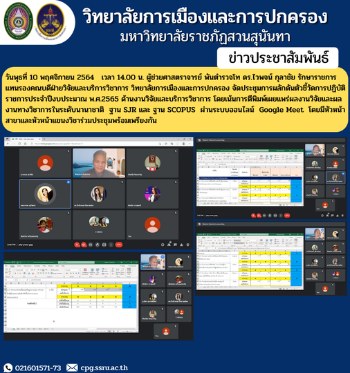 วันพุธที่ 10 พฤศจิกายน 2564 เวลา 14.00 น. ผู้ช่วยศาสตราจารย์ พันตำรวจโท ดร.ไวพจน์ กุลาชัย รักษาราชการแทนรองคณบดีฝ่ายวิจัยและบริการวิชาการ วิทยาลัยการเมืองและการปกครอง จัดประชุมการผลักดันตัวชี้วัดการปฏิบัติราชการประจำปีงบประมาณ พ.ศ.2565 ด้านงานวิจัยและบริการวิชาการ โดยเน้นการตีพิมพ์เผยแพร่ผลงานวิจัยและผลงานทางวิชาการในระดับนานาชาติ ฐาน SJR และ ฐาน SCOPUS ผ่านระบบออนไลน์ Google Meet โดยมีหัวหน้าสาขาและหัวหน้าแขนงวิชาร่วมประชุมพร้อมเพรียงกัน