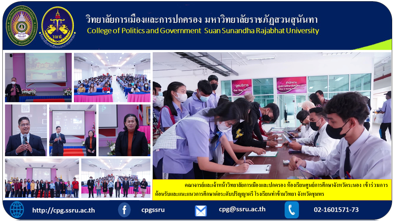 วันนี้ 10 มีนาคม 2566 คณาจารย์และเจ้าหน้าวิทยาลัยการเมืองและปกครอง ห้องเรียนศูนย์การศึกษาจังหวัดระนอง เข้าร่วมการต้อนรับและแนะแนวการศึกษาต่อระดับปริญญาตรี โรงเรียนท่าข้ามวิทยา จังหวัดชุมพร ณ ห้องประชุมศูนย์การศึกษาจังหวัดระนอง มหาวิทยาลัยราชภัฏสวนสุนันทา