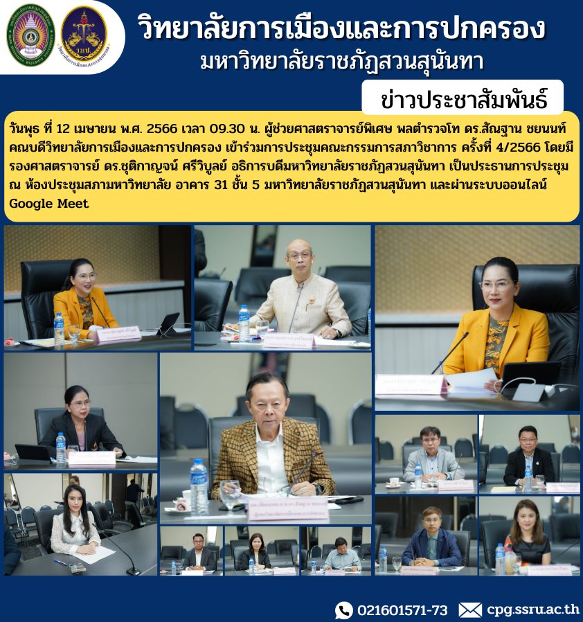 วันพุธ ที่ 12 เมษายน พ.ศ. 2566 เวลา 09.30 น. ผู้ช่วยศาสตราจารย์พิเศษ พลตำรวจโท ดร.สัณฐาน ชยนนท์ คณบดีวิทยาลัยการเมืองและการปกครอง เข้าร่วมการประชุมคณะกรรมการสภาวิชาการ ครั้งที่ 4/2566 โดยมี รองศาสตราจารย์ ดร.ชุติกาญจน์ ศรีวิบูลย์ อธิการบดีมหาวิทยาลัยราชภัฏสวนสุนันทา เป็นประธานการประชุม ณ ห้องประชุมสภามหาวิทยาลัย อาคาร 31 ชั้น 5 มหาวิทยาลัยราชภัฏสวนสุนันทา และผ่านระบบออนไลน์ Google Meet