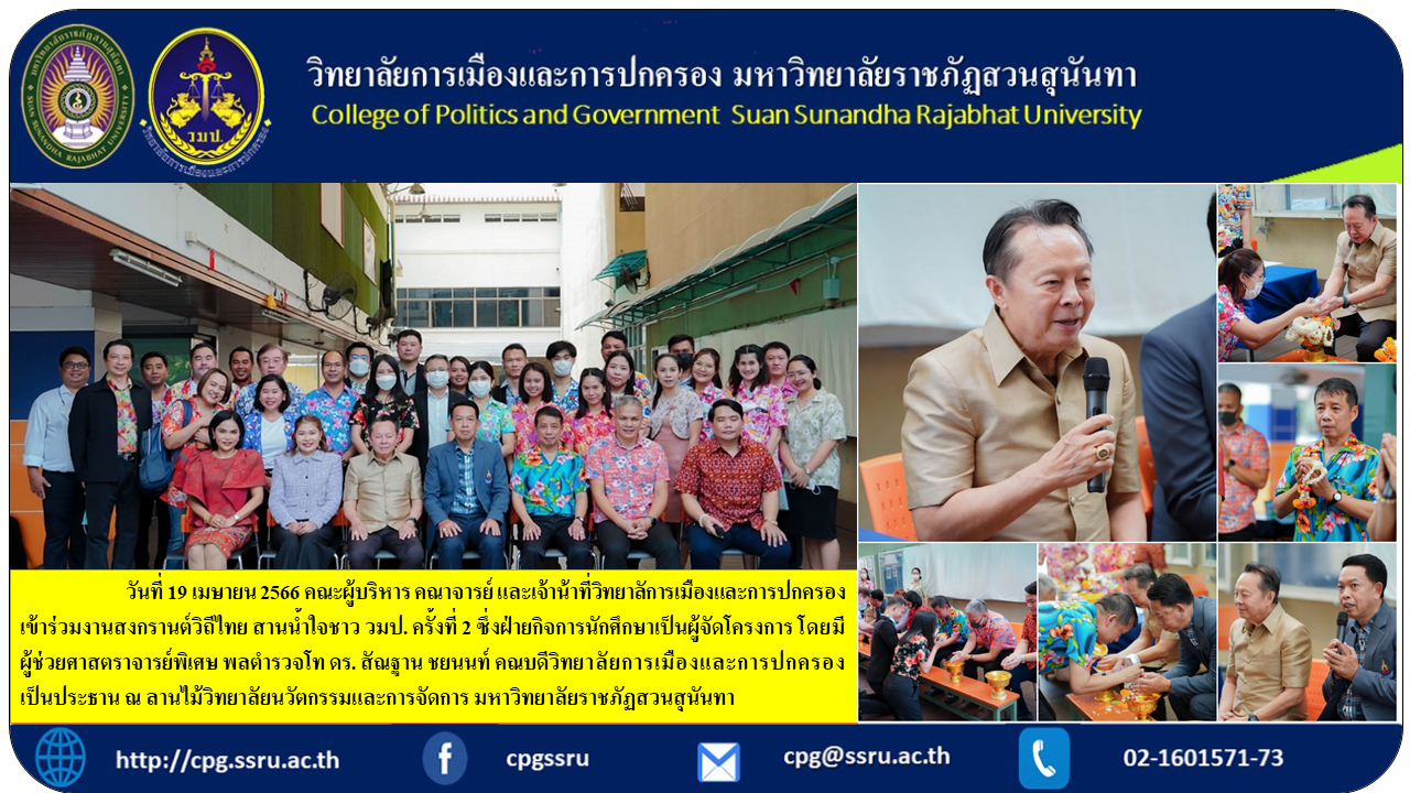 วันที่ 19 เมษายน 2566 คณะผู้บริหาร คณาจารย์ และเจ้าน้าที่วิทยาลัการเมืองและการปกครอง เข้าร่วมงานสงกรานต์วิถีไทย สานน้ำใจชาว วมป. ครั้งที่ 2 ซึ่งฝ่ายกิจการนักศึกษาเป็นผู้จัดโครงการ โดยมี ผู้ช่วยศาสตราจารย์พิเศษ พลตำรวจโท ดร. สัณฐาน ชยนนท์ คณบดีวิทยาลัยการเมืองและการปกครอง เป็นประธาน ณ ลานไม้วิทยาลัยนวัตกรรมและการจัดการ มหาวิทยาลัยราชภัฏสวนสุนันทา