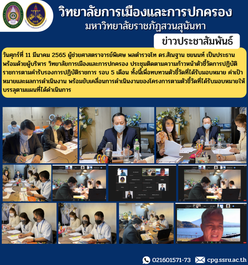 วันศุกร์ที่ 11 มีนาคม 2565 ผู้ช่วยศาสตราจารย์พิเศษ พลตำรวจโท ดร.สัณฐาน ชยนนท์ เป็นประธาน พร้อมด้วยผู้บริหาร วิทยาลัยการเมืองและการปกครอง ประชุมติดตามความก้าวหน้าตัวชี้วัดการปฏิบัติราชการตามคำรับรองการปฏิบัติราชการ รอบ 5 เดือน ทั้งนี้เพื่อทบทวนตัวชี้วัดที่ได้รับมอบหมาย ค่าเป้าหมายและผลการดำเนินงาน พร้อมขับเคลื่อนการดำเนินงานของโครงการตามตัวชี้วัดที่ได้รับมอบหมายให้บรรลุตามแผนที่ได้ดำเนินการ