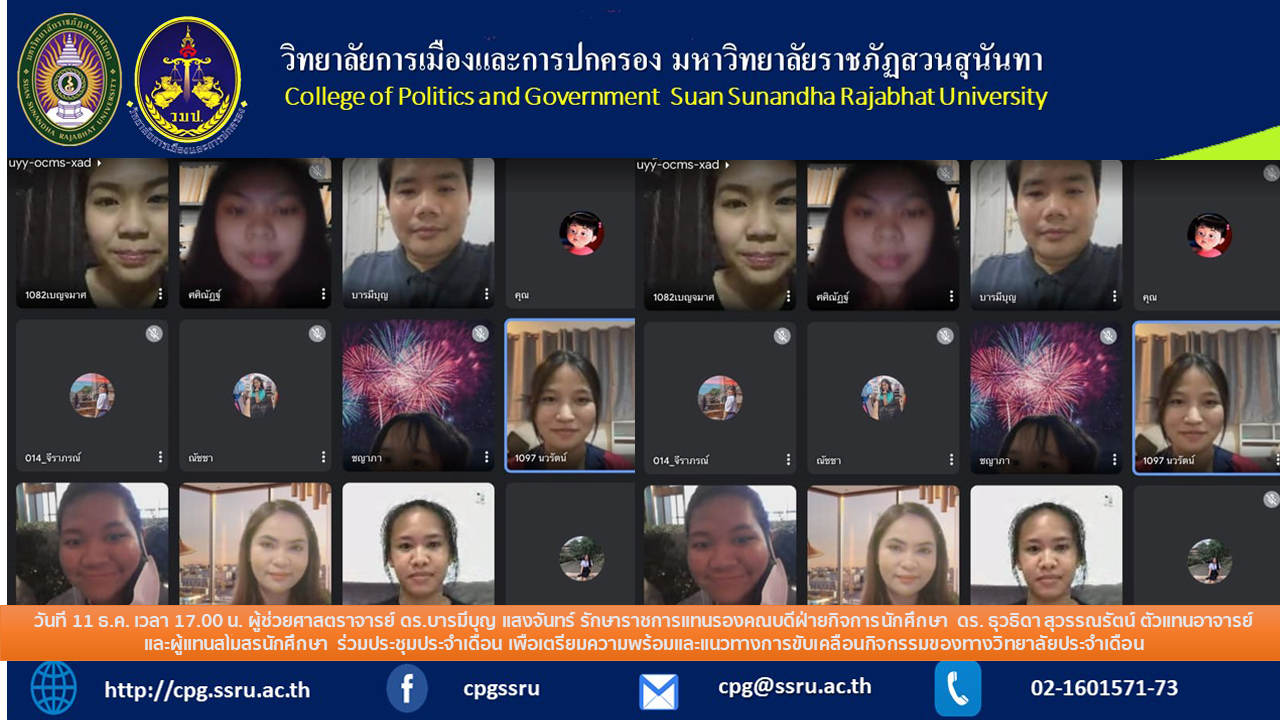 วันที่ 11 ธ.ค. เวลา 17.00 น. ผู้ช่วยศาสตราจารย์ ดร.บารมีบุญ แสงจันทร์ รักษาราชการแทนรองคณบดีฝ่ายกิจการนักศึกษา ดร. ธุวธิดา สุวรรณรัตน์ ตัวแทนอาจารย์ และผู้แทนสโมสรนักศึกษา ร่วมประชุมประจำเดือน เพื่อเตรียมความพร้อมและแนวทางการขับเคลื่อนกิจกรรมของทางวิทยาลัยประจำเดือน