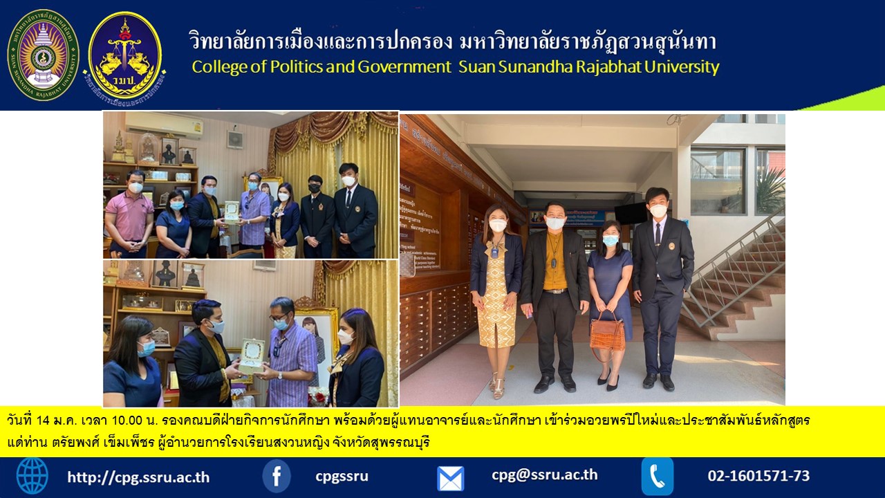 วันที่ 14 ม.ค. เวลา 10.00 น. รองคณบดีฝ่ายกิจการนักศึกษา พร้อมด้วยผู้แทนอาจารย์และนักศึกษา เข้าร่วมอวยพรปีใหม่และประชาสัมพันธ์หลักสูตร แด่ท่าน ตรัยพงศ์ เข็มเพ็ชร ผู้อำนวยการโรงเรียนสงวนหญิง จังหวัดสุพรรณบุรี