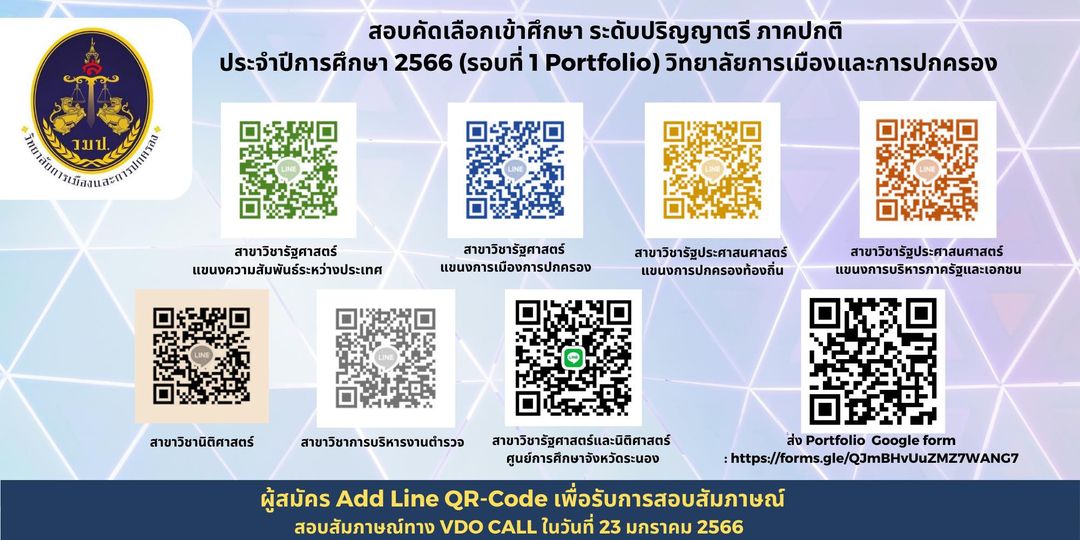 การสอบสัมภาษณ์เพื่อคัดเลือกเข้าศึกษา ระดับปริญญาตรี ภาคปกติ ประจำปีการศึกษา 2566 (รอบที่ 1 Portfolio) ให้ผู้สมัครแสกนคิวอาร์โค้ดเข้ากลุ่มไลน์ ตามสาขาที่ลงสมัครไว้เพื่อรอเข้าห้องสัมภาษณ์ วันที่ 23 มกราคม พ.ศ. 2566