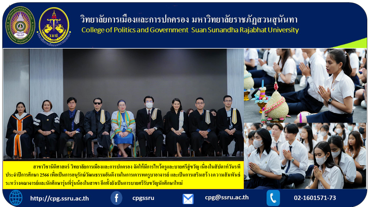 สาขาวิชานิติศาสตร์ วิทยาลัยการเมืองและการปกครอง จัดให้มีการไหว้ครูและบายศรีสู่ขวัญ เนื่องในสัปดาห์วันรพี ประจำปีการศึกษา 2566 เพื่อเป็นการอนุรักษ์วัฒนธรรมอันดีงามในการเคารพครูบาอาจารย์ และเป็นการเสริมสร้างความสัมพันธ์ระหว่างคณาจารย์และนักศึกษารุ่นพี่รุ่นน้องในสาขา อีกทั้งยังเป็นการบายศรีรับขวัญนักศึกษาใหม่ด้วย..