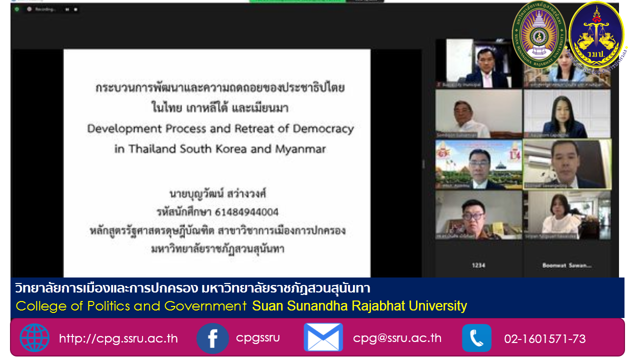 ขอแสดงความยินดีกับ นายบุญวัฒน์ สว่างวงศ์ หลักสูตรรัฐศาสตรดุษฎีบัณฑิต สาขาวิชาการเมืองการปกครอง รุ่น 5 เนื่องในโอกาสได้ผ่านการสอบป้องกันวิทยานิพนธ์ (สอบจบ) ผลการประเมินค่าระดับคะแนนของวิทยานิพนธ์อยู่ในระดับดีเยี่ยม (Excellent) โดยจัดสอบในรูปแบบออนไลน์ ขอขอบคุณคณะกรรมการสอบป้องกันวิทยานิพนธ์