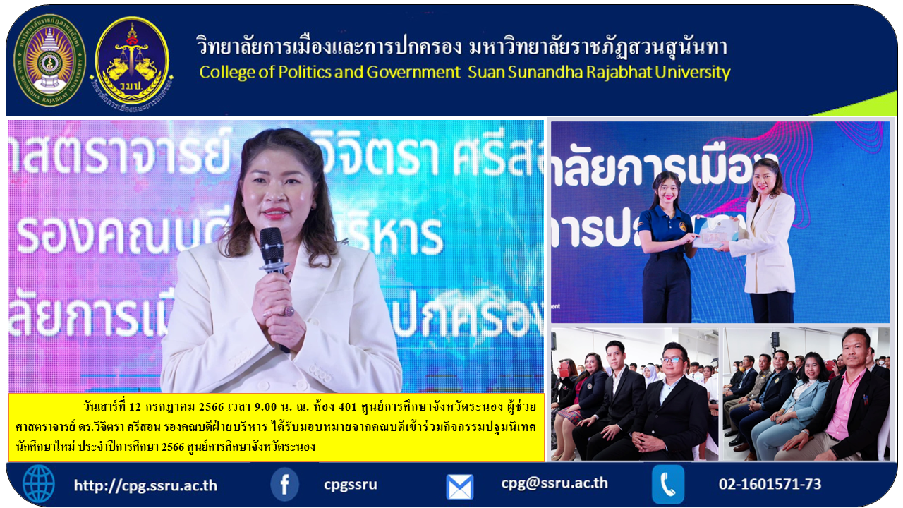 วันเสาร์ ที่ 12 กรกฎาคม 2566 เวลา 9.00 น. ณ. ห้อง 401 ศูนย์การศึกษาจังหวัดระนอง ผู้ช่วยศาสตราจารย์ ดร.วิจิตรา ศรีสอน รองคณบดีฝ่ายบริหาร ได้รับมอบหมายจากคณบดีเข้าร่วมกิจกรรมปฐมนิเทศนักศึกษาใหม่ ประจำปีการศึกษา 2566 ศูนย์การศึกษาจังหวัดระนอง โดยมีรองศาสตราจารย์ ดร. ชุติกาญจน์ ศรีวิบูลย์ อธิการบดี เป็นประธาน พร้อมให้โอวาทและกล่าวต้อนรับโดยมีผู้บริหารระดับมหาวิทยาลัยได้แก่รองอธิการบดีและผู้บริหารระดับคณะและวิทยาลัยคณาจารย์รวมถึงนักศึกษาใหม่ ศูนย์การศึกษาจังหวัดระนอง ประจำปีการศึกษา 2566 เข้าร่วมกิจกรรมโดยพร้อมเพรียง สำหรับวิทยาลัยที่เปิดทำการเรียนการสอน ณ ศูนย์การศึกษาจังหวัดระนอง ได้แก่ วิทยาลัยการเมืองและการปกครอง วิทยาลัยการจัดการอุตสาหกรรมและบริการ วิทยาลัยโลจิสติกส์และซัพพลายเชน และวิทยาลัยนวัตกรรมและการจัดการ