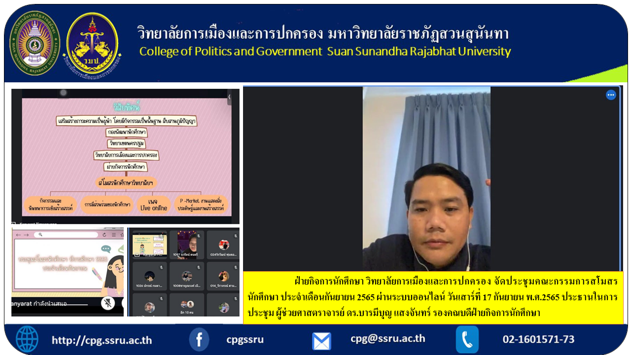 ฝ่ายกิจการนักศึกษา วิทยาลัยการเมืองและการปกครอง จัดประชุมคณะกรรมการสโมสรนักศึกษา ประจำเดือนกันยายน 2565 ผ่านระบบออนไลน์ วันเสาร์ที่ 17 กันยายน พ.ศ.2565 ประธานในการประชุม ผู้ช่วยศาสตราจารย์ ดร.บารมีบุญ แสงจันทร์ รองคณบดีฝ่ายกิจการนักศึกษา มีวาระการประชุม แนะนำสมาชิกใหม่ของสโมสรนักศึกษา การดำเนินการตามแผนปฏิบัติราชการประจำปีงบประมาณ 2566 การดำเนินการจัดโครงการประชาสัมพันธ์หลักสูตรของวิทยาลัย เช่น การทำความร่วมมือทางวิชาการกับโรงเรียนในเครือข่าย การประชาสัมพันธ์ ณ โรงเรียนระดับมัธยมศึกษาต่างๆ การจัดกิจกรรม Open House ของมหาวิทยาลัย และประธานได้เน้นย้ำในการทำงานต่อไปนี้ จะอยู่ภายใต้แนวคิดการพลิกโฉมของมหาวิทยาลัย ที่สอดคล้องกับวิสัยทัศน์ “เสริมสร้างความเป็นผู้นำ โดยมีกิจกรรมเป็นพื้นฐาน สืบสานภูมิปัญญา” โดยเน้นกิจกรรมของฝ่ายกิจการนักศึกษาในเชิงสร้างสรรค์ ผลักดันศักยภาพของนักศึกษา ให้มีการพัฒนาควบคู่กับการเรียนในรั้วมหาวิทยาลัย