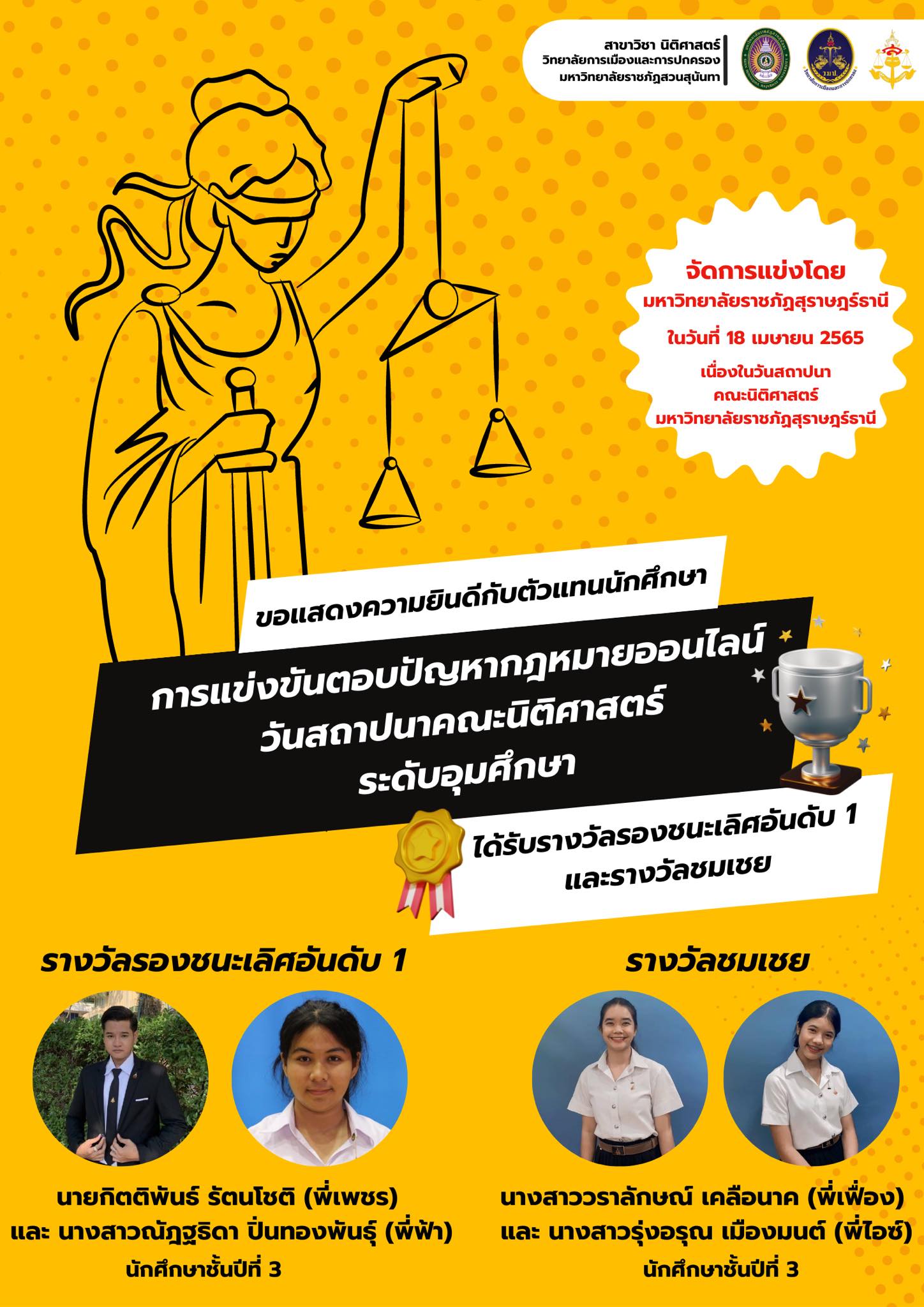 ขอแสดงความยินกับพี่ๆชั้นปีที่ 3 ตัวแทนนักศึกษาสาขาวิชานิติศาสตร์ มหาวิทยาลัยราชภัฏสวนสุนันทาโดยมี พี่เพชร(นายกิตติพันธ์ รัตนโชติ) พี่ฟ้า(นางสาวณัฎฐธิดา ปิ่นทองพันธุ์) ทีมSSRU-01 และพี่เฟื่อง (นางสาววราลักษณ์ เคลือนาค) พี่ไอซ์ (นางสาวรุ่งอรุณ เมืองมนต์) ทีมSSRU-02 ได้เข้าแแข่งขันตอบปัญหากฎหมายออนไลน์เนื่องในวันสถาปนาคณะนิติศาสตร์ มหาวิทยาลัยราชภัฎสุราษฎร์ธานี ระดับอุดมศึกษา (ปริญญาตรี) จำนวน 22 ทีม จาก 12 มหาวิทยาลัยทั่วประเทศ ในวันที่ 18 เมษายน 2565 ผลปรากฎว่าได้ รางวัลรองชนะเลิศ อันดับที่ 1 มหาวิทยาลัยราชภัฎสวนสุนันทา ทีม 01 และ รางวัลชมเชย มหาวิทยาลัยราชภัฎสวนสุนันทา ทีม 02