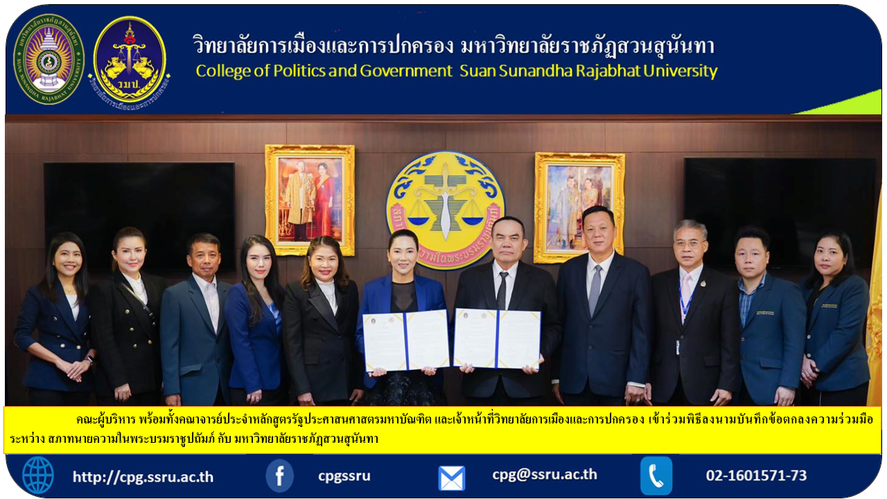 วันที่ 18 กรกฎาคม 2566 เวลา 10.00 น. คณะผู้บริหาร พร้อมทั้งคณาจารย์ประจำหลักสูตรรัฐประศาสนศาสตรมหาบัณฑิต และเจ้าหน้าที่วิทยาลัยการเมืองและการปกครอง เข้าร่วมพิธีลงนามบันทึกข้อตกลงความร่วมมือระหว่าง สภาทนายความในพระบรมราชูปถัมภ์ กับ มหาวิทยาลัยราชภัฏสวนสุนันทา ซึ่งมีวัตถุประสงค์เพื่อสร้างความร่วมมือด้านวิชาการ การจัดการศึกษา ส่งเสริมและพัฒนาด้านวิชาการ ด้านนวัตกรรมและการวิจัยของทั้งสองฝ่าย และแลกเปลี่ยนด้านวิชาการและความช่วยเหลือทางกฎหมาย การเสริมสร้างและพัฒนาศักยภาพของบุคลากรทั้งสองฝ่าย โดยมี รองศาสตราจารย์ ดร.ชุติกาญจน์ ศรีวิบูลย์ อธิการบดีมหาวิทยาลัยราชภัฏสวนสุนันทา และ ดร.วิเชียร ชุบไธสง นายกสภาทนายความ เป็นประธาน ณ สภาทนายความในพระบรมราชูถัมภ์