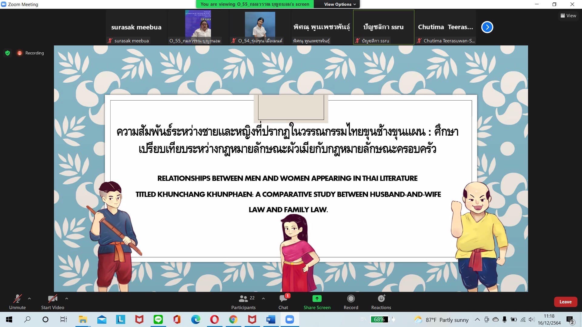 6. กมลวรรณ บุญถนอม นำเสนอบทความเรื่อง “ความสัมพันธ์ระหว่างชายและหญิงที่ปรากฏในวรรณกรรมไทยขุนช้างขุนแผน : ศึกษาเปรียบเทียบระหว่างกฎหมายลักษณะผัวเมียกับกฎหมายลักษณะครอบครัว” โดยมีผู้ช่วยศาตราจารย์ ดร.กมลวรรณ อยู่วัฒนะ เป็นอาจารย์ที่ปรึกษาบทความวิจัย