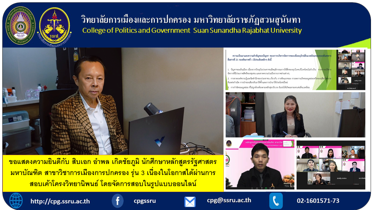 ขอแสดงความยินดีกับ สิบเอก อำพล เกิดชัยภูมิ นักศึกษาหลักสูตรรัฐศาสตรมหาบัณฑิต สาขาวิชาการเมืองการปกครอง รุ่น 3 เนื่องในโอกาสได้ผ่านการสอบเค้าโครงวิทยานิพนธ์ โดยจัดการสอบในรูปแบบออนไลน์