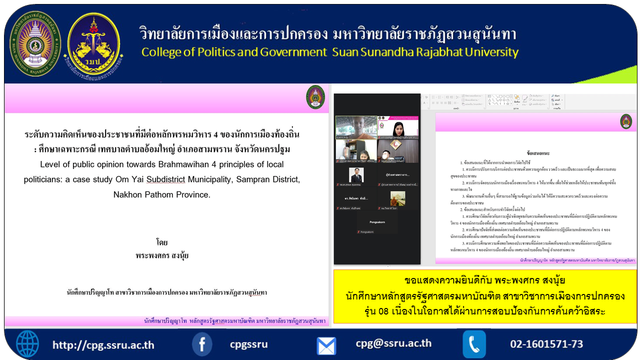 ขอแสดงความยินดีกับ พระ พงศกร สงนุ้ย นักศึกษาหลักสูตรรัฐศาสตรมหาบัณฑิต สาขาวิชาการเมืองการปกครอง รุ่น 08 เนื่องในโอกาสได้ผ่านการสอบป้องกันการค้นคว้าอิสระ ผลการประเมินค่าระดับคะแนนของการค้นคว้าอิสระอยู่ในระดับดี (Good) โดยจัดการสอบในรูปแบบออนไลน์