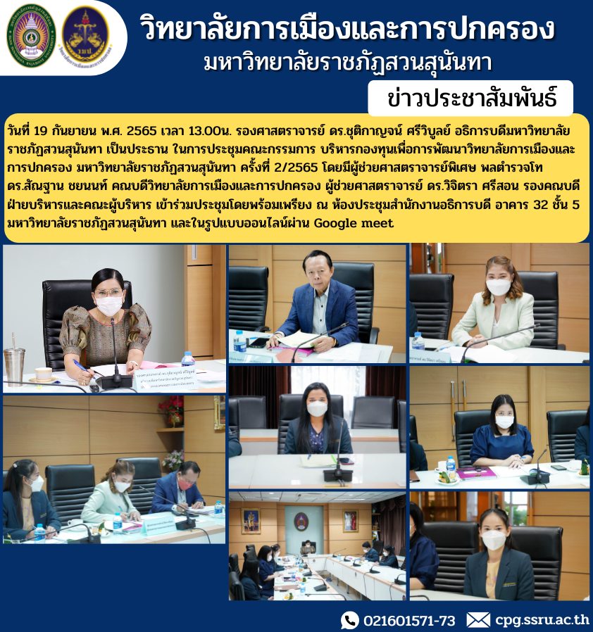 วันที่ 19 กันยายน พ.ศ. 2565 เวลา 13.30 น. รองศาสตราจารย์ ดร.ชุติกาญจน์ ศรีวิบูลย์ อธิการบดีมหาวิทยาลัยราชภัฏสวนสุนันทา เป็นประธาน ในการประชุมคณะกรรมการอำนวยการวิทยาลัยการเมืองและการปกครอง ครั้งที่ 4/2565 พร้อมด้วยผู้ทรงคุณวุฒิ โดยมีผู้ช่วยศาสตราจารย์พิเศษ พลตำรวจโท ดร.สัณฐาน ชยนนท์ คณบดีวิทยาลัยการเมืองและการปกครอง ผู้ช่วยศาสตราจารย์ ดร.วิจิตรา ศรีสอน รองคณบดีฝ่ายบริหารและคณะผู้บริหาร เข้าร่วมประชุมโดยพร้อมเพรียง ณ ห้องประชุมสำนักงานอธิการบดี อาคาร 32 ชั้น 5 มหาวิทยาลัยราชภัฏสวนสุนันทา และในรูปแบบออนไลน์ผ่าน Google meet