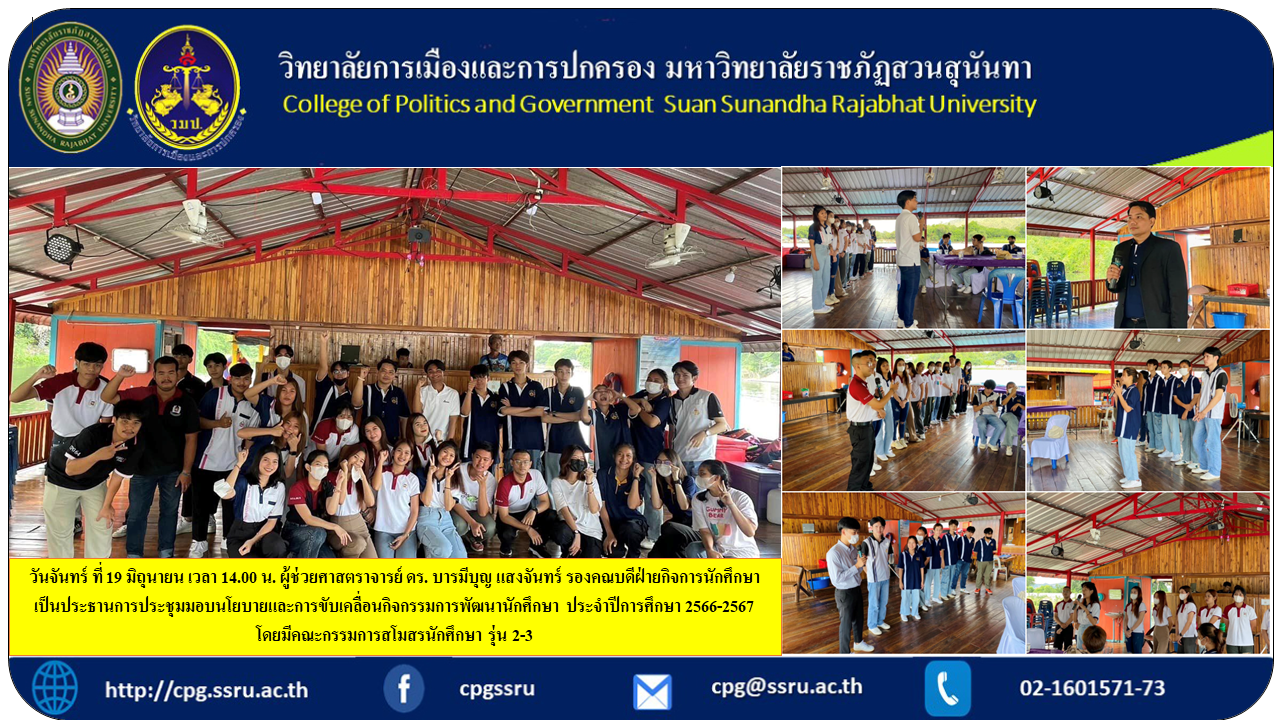 วันจันทร์ ที่ 19 มิถุนายน เวลา 14.00 น. ผู้ช่วยศาสตราจารย์ ดร. บารมีบุญ แสงจันทร์ รองคณบดีฝ่ายกิจการนักศึกษา เป็นประธานการประชุมมอบนโยบายและการขับเคลื่อนกิจกรรมการพัฒนานักศึกษา ประจำปีการศึกษา 2566-2567 โดยมีคณะกรรมการสโมสรนักศึกษา รุ่น 2-3 ส่วนกลางและวิทยาเขตนครปฐม เข้าร่วมการประชุม โดยการประชุม ณ. สมพงษ์รีสอร์ต จังหวัดกาญจนบุรี