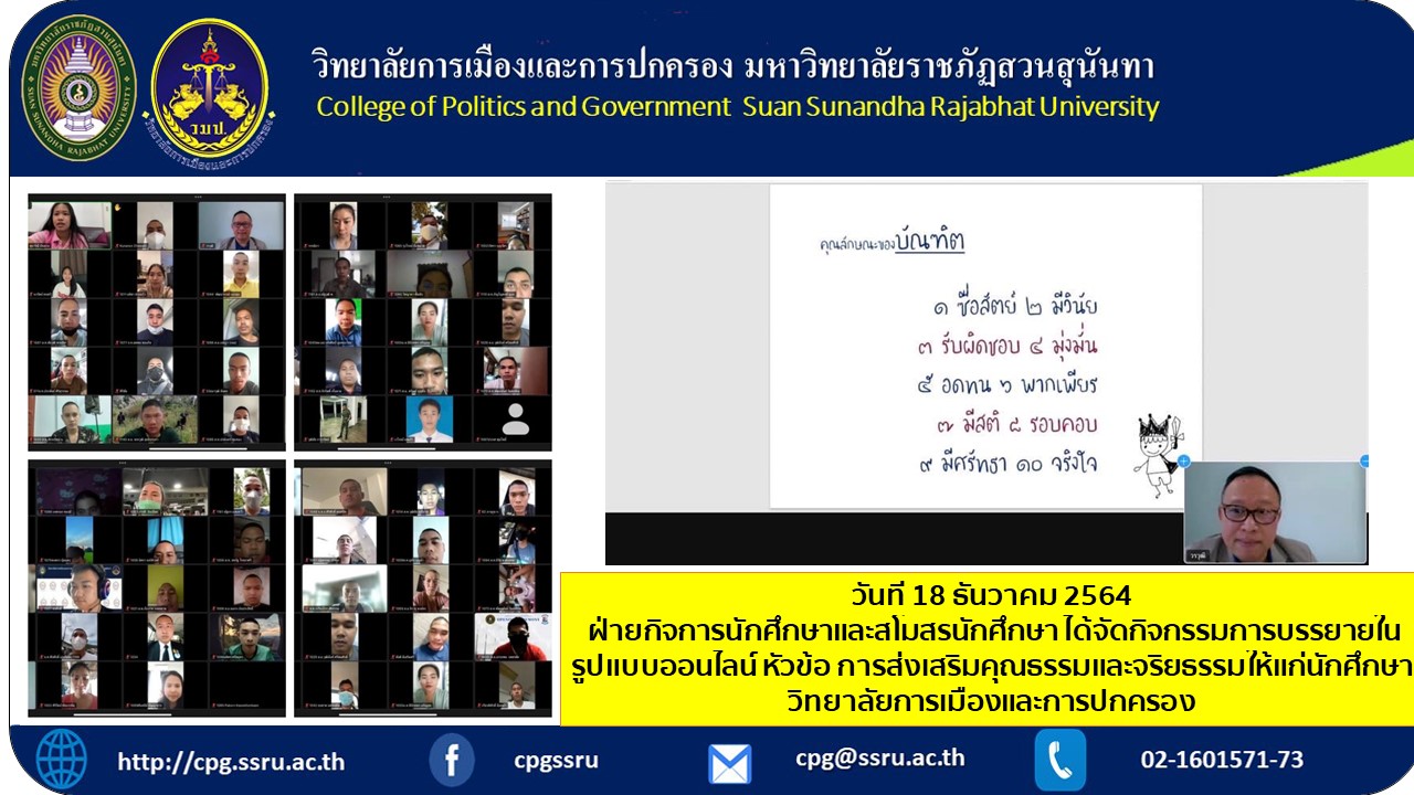 วันที่ 19 ธันวาคม 2564 เวลา 10.00-12.00 น. ฝ่ายกิจการนักศึกษาและสโมสรนักศึกษา ได้จัดกิจกรรมการบรรยายในรูปแบบออนไลน์ หัวข้อ การส่งเสริมคุณธรรมและจริยธรรมให้แก่นักศึกษา วิทยาลัยการเมืองและการปกครอง โดยวิทยากร ดร.วรวุฒิ แสงเฟื่อง ในกิจกรรมดังกล่าวมีนักศึกษาภาคปกติและภาคพิเศษ โครงการความร่วมมือกองทัพบก จำนวนกว่า 160 คน ซึ่งมีวัตถุประสงค์เพื่อส่งเสริมคุณธรรมและจริยธรรม การตระหนักและการนำไปประยุกต์ปฏิบัติให้เกิดประโยชน์ต่อตนเองและสังคมต่อไป