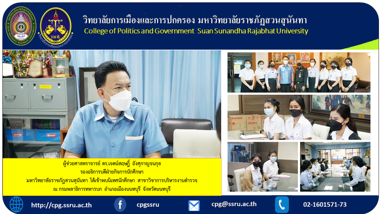 เช้าวันที่ 20 มกราคม พ.ศ.2565 ผู้ช่วยศาสตราจารย์ ดร.เจตน์สฤษฎิ์ อังศุกาญจนกุล รองอธิการบดีฝ่ายกิจการนักศึกษา มหาวิทยาลัยราชภัฎสวนสุนันทา ได้เข้าพบนิเทศนักศึกษา สาขาวิชาการบริหารงานตำรวจ ณ กรมพลาธิการทหารบก อำเภอเมืองนนทบุรี จังหวัดนนทบุรี นักศึกษาจำนวน 5 คน สำนักสวัสดิการทหาร กองบัญชาการกองทัพไทย เขตบางซื่อ กรุงเทพฯ นักศึกษาจำนวน 3 คน และกรมการอุตสาหกรรมทหาร เขตดุสิต กรุงเทพฯ นักศึกษาจำนวน 8 คน
