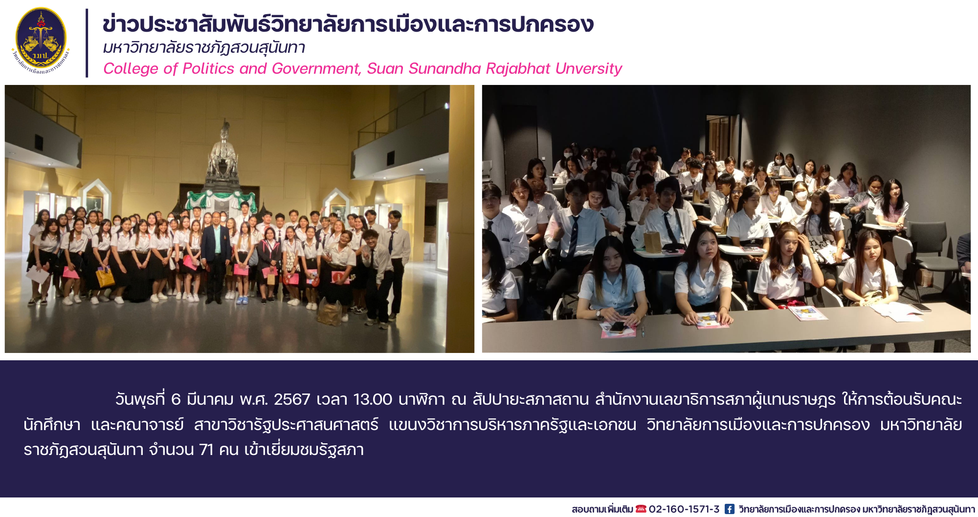 วันพุธที่ 6 มีนาคม พ.ศ. 2567 เวลา 13.00 นาฬิกา ณ สัปปายะสภาสถาน สำนักงานเลขาธิการสภาผู้แทนราษฎร ให้การต้อนรับคณะนักศึกษา และคณาจารย์ สาขาวิชารัฐประศาสนศาสตร์ แขนงวิชาการบริหารภาครัฐและเอกชน วิทยาลัยการเมืองและการปกครอง มหาวิทยาลัยราชภัฏสวนสุนันทา จำนวน 71 คน เข้าเยี่ยมชมรัฐสภา โดยคณะฯ รับชมวีดิทัศน์ “รัฐสภาไทย” และรับฟังบรรยายความรู้เกี่ยวกับการรับฟังความคิดเห็นต่อร่างกฎหมายตามมาตรา 77 ห้องบรรยาย (Auditorium) ชั้น MB1 จากนั้นเข้าชมนิทรรศการพระราชประวัติพระบาทสมเด็จพระปกเกล้าเจ้าอยู่หัว รัชกาลที่ 7 ณ พิพิธภัณฑ์รัฐสภา ชั้น MB1 และเข้าฟังการประชุมสภาผู้แทนราษฎร โดยมีนางธิวัลรัตน์ อังกินันทน์ สมาชิกสภาผู้แทนราษฎร จังหวัดเพชรบุรี เขต 1พรรครวมไทยสร้างชาติ และนางสาวเพ็ญชิสา หงษ์อุปถัมภ์ชัย สมาชิกสภาผู้แทนราษฎร แบบบัญชีรายชื่อพรรคเพื่อไทย ร่วมให้การต้อนรับ