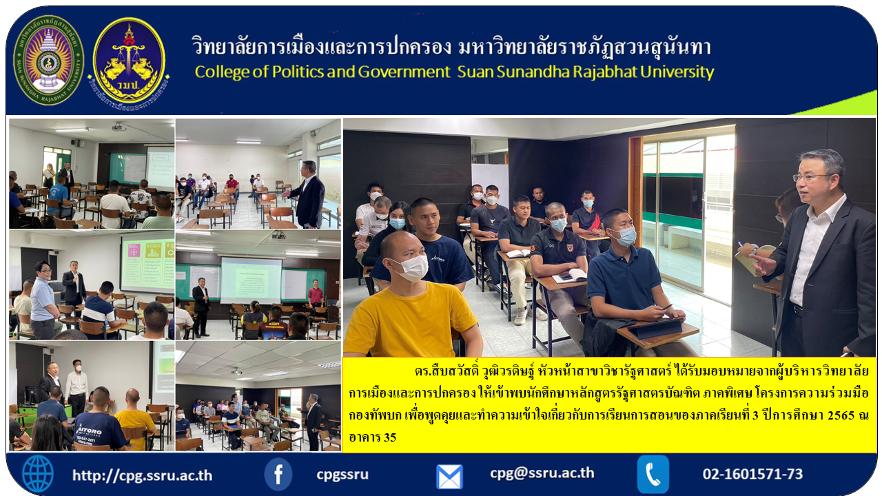 วันที่ 22 เมษายน 2566 ดร.สืบสวัสดิ์ วุฒิวรดิษฐ์ หัวหน้าสาขาวิชารัฐศาสตร์ ได้รับมอบหมายจากผู้บริหารวิทยาลัยการเมืองและการปกครอง ให้เข้าพบนักศึกษาหลักสูตรรัฐศาสตรบัณฑิต ภาคพิเศษ โครงการความร่วมมือกองทัพบก เพื่อพูดคุยและทำความเข้าใจเกี่ยวกับการเรียนการสอนของภาคเรียนที่ 3 ปีการศึกษา 2565 ณ อาคาร 35 คณะมนุษยศาสตร์และสังคมศาสตร์ มหาวิทยาลัยราชภัฏสวนสุนันทา