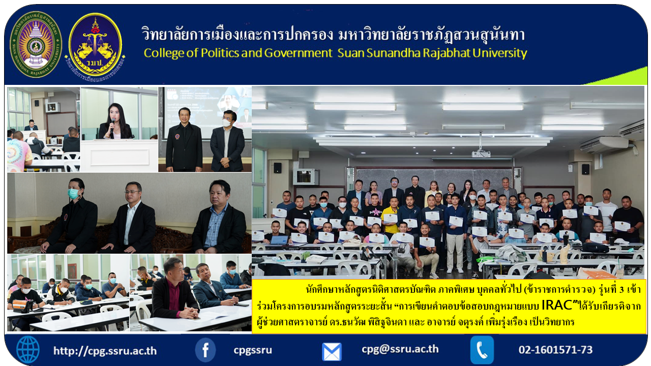 วันที่ 22-23 เมษายน 2566 ฝ่ายบริการการศึกษา วิทยาลัยการเมืองและการปกครอง มหาวิทยาลัยราชภัฏสวนสุนันทา ได้จัดโครงการอบรมหลักสูตรระยะสั้น “การเขียนคำตอบข้อสอบกฎหมายแบบ IRAC” ซึ่งเป็นวิธีการในการจัดรูปแบบการเขียนในทางกฎหมายที่ใช้กันมากในสหรัฐอเมริกา ให้กับนักศึกษาหลักสูตรนิติศาสตรบัณฑิต (ภาคพิเศษ) และบุคคลทั่วไปที่สนใจโดยไม่มีค่าใช้จ่ายในการอบรม ณ ห้อง 47/4701 อาคาร 47 คณะเทคโนโลยีอุตสาหกรรม มหาวิทยาลัยราชภัฏสวนสุนันทา กรุงเทพมหานคร โดยได้รับเกียรติจาก อาจารย์ ดร.กีรติวรรณ กัลยาณมิตร รองคณบดีฝ่ายวิชาการ เป็นประธานกล่าวเปิดงาน บรรยายโดย ผู้ช่วยศาสตราจารย์ ธนวัฒ พิสิฐจินดา และอาจารย์จตุรงค์ เพิ่มรุ่งเรือง อาจารย์หลักสูตรนิติศาสตรบัณฑิต วิทยาลัยการเมืองและการปกครอง โดยมีนักศึกษาและผู้สนใจเข้าร่วมการอบรมกว่า 70 คน และได้รับเกียรติจาก ผู้ช่วยศาสตราจารย์ ดร.วิจิตรา ศรีสอน รองคณบดีฝ่ายบริหาร วิทยาลัยการเมืองและการปกครอง มอบเกียรติบัตรแก่ผู้เข้าร่วมการอบรม ตามยุทธศาสตร์มหาวิทยาลัยราชภัฏสวนสุนันทาในการพัฒนามหาวิทยาลัยให้เป็นเอตทัคคะและผลิตบัณฑิตให้เป็นมืออาชีพกับมหาวิทยาลัยเอตทัคคะที่มีอัตลักษณ์ (Niche Guru University)