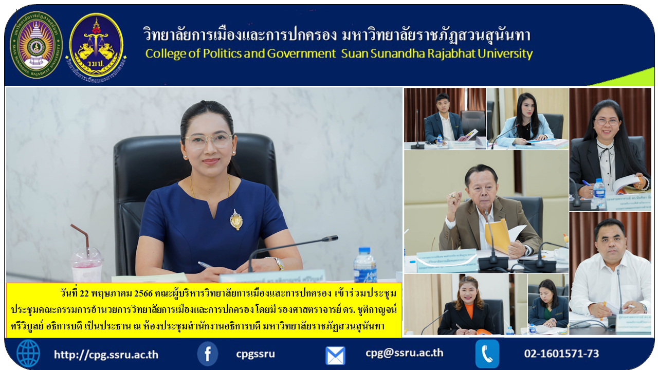 วันที่ 22 พฤษภาคม 2566 คณะผู้บริหารวิทยาลัยการเมืองและการปกครอง เข้าร่วมประชุมประชุมคณะกรรมการอำนวยการวิทยาลัยการเมืองและการปกครอง โดยมี รองศาสตราจารย์ ดร. ชุติกาญจน์ ศรีวิบูลย์ อธิการบดี เป็นประธาน ณ ห้องประชุมสำนักงานอธิการบดี มหาวิทยาลัยราชภัฏสวนสุนันทา