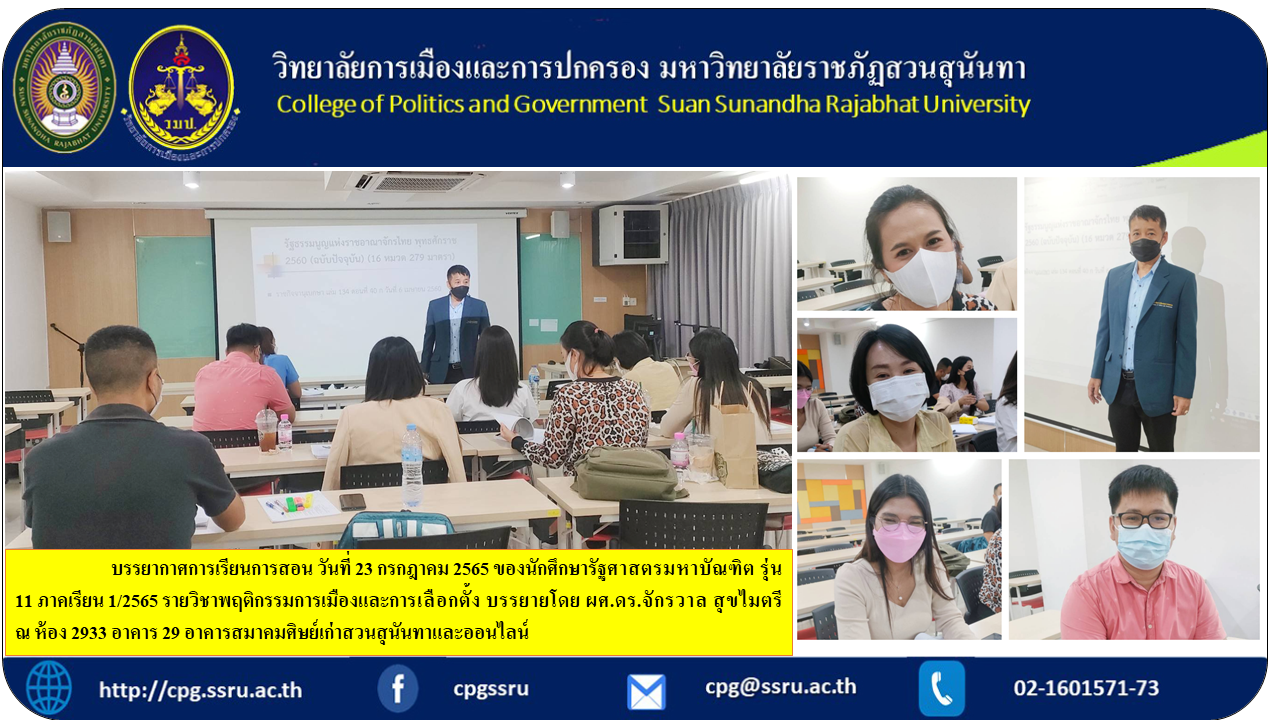 บรรยากาศการเรียนการสอน วันที่ 23 กรกฎาคม 2565 ของนักศึกษารัฐศาสตรมหาบัณฑิต รุ่น 11 ภาคเรียน 1/2565 รายวิชาพฤติกรรมการเมืองและการเลือกตั้ง บรรยายโดย ผศ.ดร.จักรวาล สุขไมตรี ณ ห้อง 2933 อาคาร 29 อาคารสมาคมศิษย์เก่าสวนสุนันทาและออนไลน์