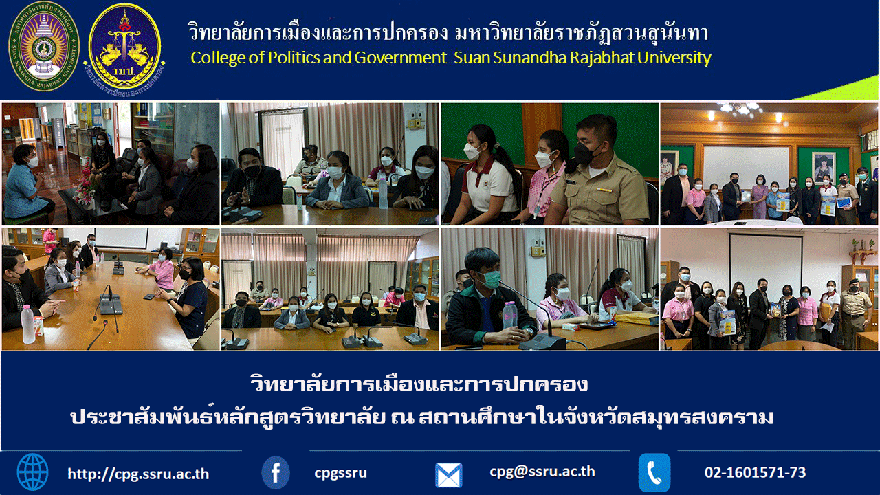 วันที่ 23 พ.ย. ผศ.ดร.บารมีบุญ แสงจันทร์ รักษาราชการแทนรองคณบดีฝ่ายกิจการนักศึกษา อ.ดร.ธุวธิดา สุวรรณรัตน์ อ.ดร.ธิดา นิติธรญาดา อ.ดร.พิมชนา ศรีบุณยพรรัฐ อ.รพีพัฒน์ จันทนินทร ผู้แทนอาจารย์ พร้อมด้วยเจ้าหน้าที่ และนักศึกษาเข้าร่วมประชาสัมพันธ์หลักสูตรของวิทยาลัย ณ.สถานศึกษาในจังหวัดสมุทรสงครามได้แก่ โรงเรียนศรัทธาสมุทร และ โรงเรียนถาวรานุกูล ซึ่งได้รับการตอบรับและประสานความร่วมมือทางวิชาการกับผู้บริหาร คณาจารย์โรงเรียนดังกล่าวเป็นอย่างดี