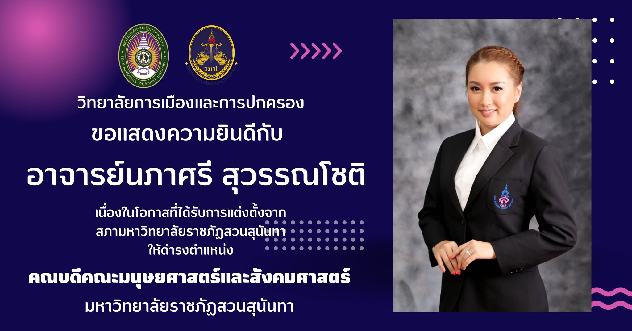 วิทยาลัยการเมืองและปกครอง มหาวิทยาลัยราชภัฏสวนสุนันทา ขอแสดงความยินดีเป็นอย่างยิ่งกับผู้อำนวยการสำนักวิชาการศึกษาทั่วไปและนวัตกรรมการเรียนรู้อิเล็กทรอนิกส์ อาจารย์นภาศรี สุวรรณโชติ ในโอกาสที่ได้รับการแต่งตั้งจากสภามหาวิทยาลัยราชภัฏสวนสุนันทา ในคราวประชุมครั้งที่ 9/2565 ให้ดำรงตำแหน่งคณบดีคณะมนุษยศาสตร์และสังคมศาสตร์ มหาวิทยาลัยราชภัฏสวนสุนันทา ในนามของผู้บริหาร คณาจารย์ เจ้าหน้าที่ และนักศึกษาวิทยาลัยการเมืองและการปกครองขอแสดงความยินดีมา ณ โอกาสนี้