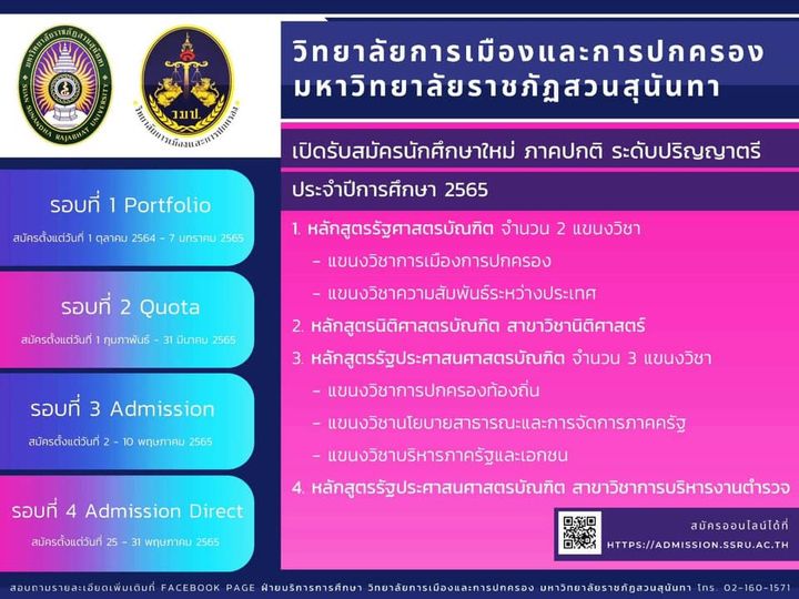 รายละเอียดเพิ่มเติมได้ที่ >>>>> https://admission.ssru.ac.th/isqy01