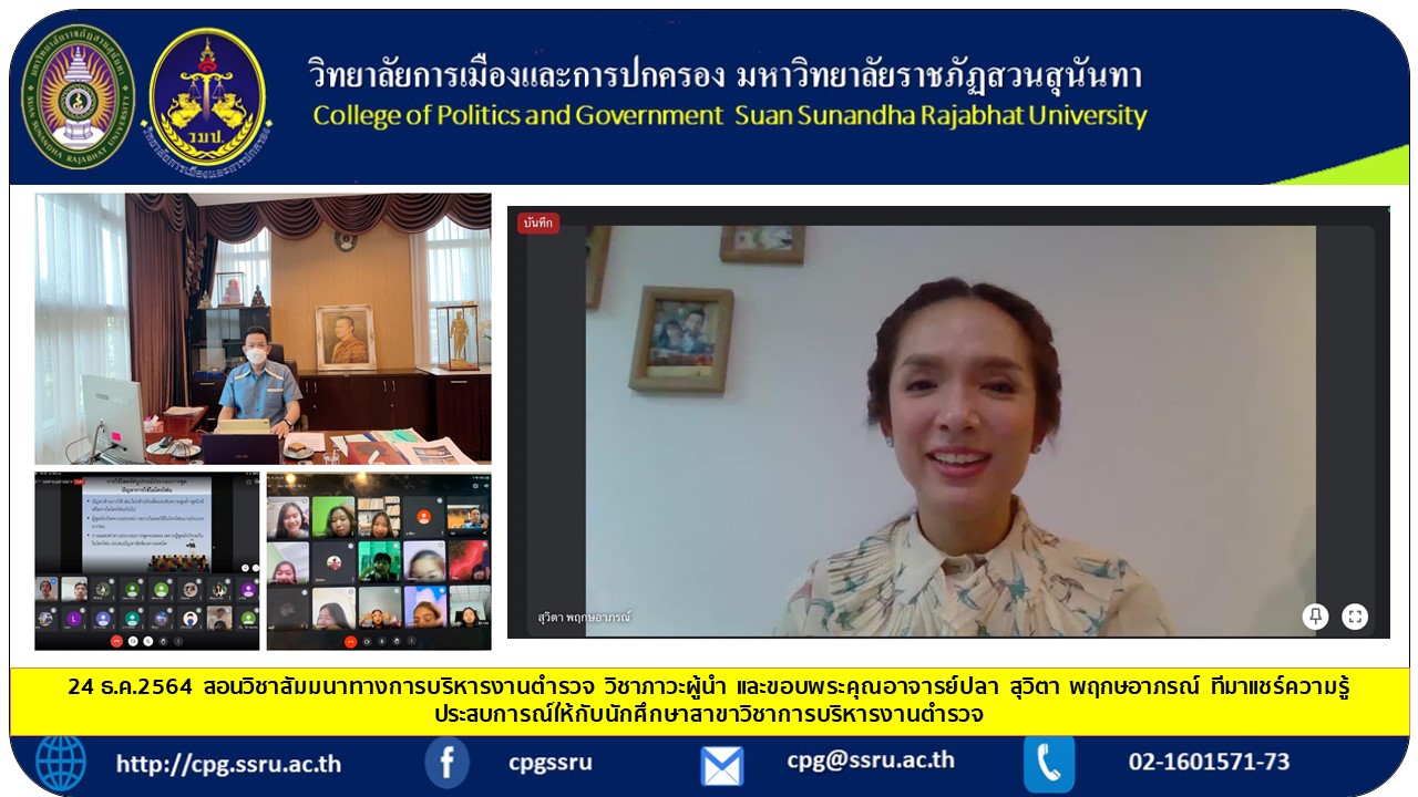 24 ธ.ค.2564 สอนวิชาสัมมนาทางการบริหารงานตำรวจ วิชาภาวะผู้นำ และขอบพระคุณอาจารย์ปลา สุวิตา พฤกษอาภรณ์ ที่มาแชร์ความรู้ประสบการณ์ให้กับนักศึกษาสาขาวิชาการบริหารงานตำรวจ