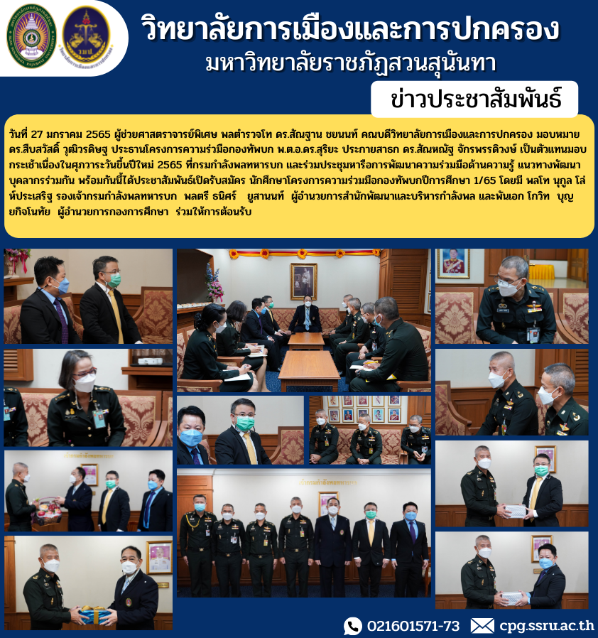 วันที่ 27 มกราคม 2565 ผู้ช่วยศาสตราจารย์พิเศษ พลตำรวจโท ดร.สัณฐาน ชยนนท์ คณบดีวิทยาลัยการเมืองและการปกครอง มอบหมาย ดร.สืบสวัสดิ์ วุฒิวรดิษฐ ประธานโครงการความร่วมือกองทัพบก พ.ต.อ.ดร.สุริยะ ประกายสาธก ดร.สัณหณัฐ จักรพรรดิวงษ์ เป็นตัวแทนมอบกระเช้าเนื่องในศุภวาระวันขึ้นปีใหม่ 2565 ที่กรมกำลังพลทหารบก และร่วมประชุมหารือการพัฒนาความร่วมมือด้านความรู้ แนวทางพัฒนาบุคลากรร่วมกัน พร้อมกันนี้ได้ประชาสัมพันธ์เปิดรับสมัคร นักศึกษาโครงการความร่วมมือกองทัพบกปีการศึกษา 1/65 โดยมี พลโท นุกูล โล่ห์ประเสริฐ รองเจ้ากรมกำลังพลทหารบก พลตรี ธนิศร์ ยูสานนท์ ผู้อำนวยการสำนักพัฒนาและบริหารกำลังพล และพันเอก โกวิท บุญยกิจโนทัย ผู้อำนวยการกองการศึกษา ร่วมให้การต้อนรับ
