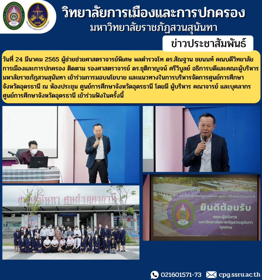วันที่ 24 มีนาคม 2565 ผู้ช่วยช่วยศาสตราจารย์พิเศษ พลตำรวจโท ดร.สัณฐาน ชยนนท์ คณบดีวิทยาลัยการเมืองและการปกครอง ติดตาม รองศาสตราจารย์ ดร.ชุติกาญจน์ ศรีวิบูลย์ อธิการบดีและคณะผู้บริหารมหาลัยราชภัฏสวนสุนันทา เข้าร่วมการมอบนโยบาย และแนวทางในการบริหารจัดการศูนย์การศึกษาจังหวัดอุดรธานี ณ ห้องประชุม ศูนย์การศึกษาจังหวัดอุดรธานี โดยมี ผู้บริหาร คณาจารย์ และบุคลากรศูนย์การศึกษาจังหวัดอุดรธานี เข้าร่วมฟังในครั้งนี้