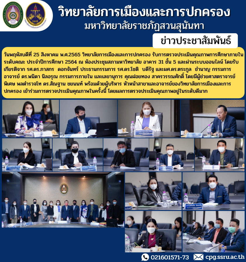 วันพฤหัสบดีที่ 25 สิงหาคม พ.ศ.2565 วิทยาลัยการเมืองและการปกครอง รับการตรวจประเมินคุณภาพการศึกษาภายใน ระดับคณะ ประจำปีการศึกษา 2564 ณ ห้องประชุมสภามหาวิทยาลัย อาคาร 31 ชั้น 5 และผ่านระบบออนไลน์ โดยรับเกียรติจาก รศ.ดร.ภาสกร ดอกจันทร์ ประธานกรรมการ รศ.ดร.โชติ บดีรัฐ และผศ.ดร.ตระกูล ชำนาญ กรรมการ อาจารย์ ดร.พนิดา นิลอรุณ กรรมการภายใน และเลขานุการ คุณฝอยทอง สาครวรรณศักดิ์ โดยมีผู้ช่วยศาสตราจารย์พิเศษ พลตำรวจโท ดร.สัณฐาน ชยนนท์ พร้อมด้วยผู้บริหาร หัวหน้าสาขาและอาจารย์ของวิทยาลัยการเมืองและการปกครอง เข้าร่วมการตรวจประเมินคุณภาพในครั้งนี้ โดยผลการตรวจประเมินคุณภาพอยู่ในระดับดีมาก