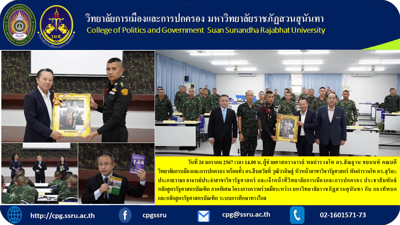 วันที่ 26 มกราคม 2567 เวลา 14.00 น. ผู้ช่วยศาสตราจารย์ พลตำรวจโท ดร.สัณฐาน ชยนนท์ คณบดีวิทยาลัยการเมืองและการปกครอง พร้อมทั้ง ดร.สืบสวัสดิ์ วุฒิวรดิษฐ์ หัวหน้าสาขาวิชารัฐศาสตร์ พันตำรวจโท ดร.สุริยะ ประภายวาธก อาจารย์ประจำสาขาวิชารัฐศาสตร์ และเจ้าหน้าที่วิทยาลัยการเมืองและการปกครอง ประชาสัมพันธ์หลักสูตรรัฐศาสตรบัณฑิต ภาคพิเศษ โครงการความร่วมมือระหว่าง มหาวิทยาลัยราชภัฏสวนสุนันทา กับ กองทัพบก และหลักสูตรรัฐศาสตรบัณฑิต ระบบการศึกษาทางไกล ซึ่งได้รับเกียรติจาก พ.อ.อวิรุธ เฉลิมวัฒน์ อาจารย์หัวหน้าแผนกวิชายุทธวิธีและฝ่ายอำนวยการ กองการฝึกอบรม เป็นผู้ต้อนรับทางคณะวิทยาลัยการเมืองและการปกครอง ณ โรงเรียนสงครามพิเศษ จังหวัดลพบุรี