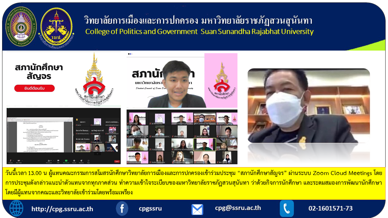 วันนี้เวลา 13.00 น ผู้แทนคณะกรรมการสโมสรนักศึกษาวิทยาลัยการเมืองและการปกครองเข้าร่วมประชุม “สภานักศึกษาสัญจร” ผ่านระบบ Zoom Cloud Meetings โดยการประชุมดังกล่าวแนะนำตัวแทนจากทุกภาคส่วน ทำความเข้าใจระเบียบของมหาวิทยาลัยราชภัฏสวนสุนันทา ว่าด้วยกิจการนักศึกษา และระดมสมองการพัฒนานักศึกษา โดยมีผู้แทนจากคณะและวิทยาลัยเข้าร่วมโดยพร้อมเพรียง