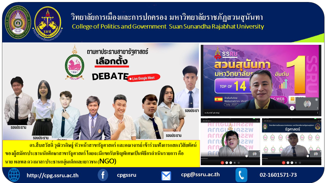 วันที่ 28 กันยายน 2565 ดร.สืบสวัสดิ์ วุฒิวรดิษฐ์ หัวหน้าสาขารัฐศาสตร์ และคณาจารย์ เข้าร่วมฟังการแสดงวิสัยทัศน์ ของผู้สมัครประธานนักศึกษาสาขารัฐศาสตร์ โดยจะมีแขกรับเชิญพิเศษเป็นพิธีกรดำเนินรายการ คือ นาย พลพล ดวงมาลา ประธานกลุ่มเด็กและเยาวชน (NGO)ด้านการเมืองและประชาธิปไตยกรมกิจการเด็กและเยาวชน และนาย ภัทรดนัย คำพา ประธานสภานักศึกษา มหาวิทยาลัยราชภัฏสวนสุนันทา