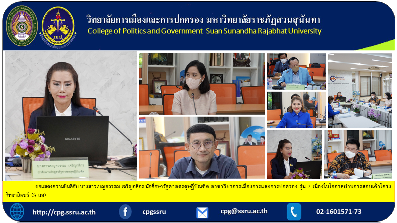 ขอแสดงความยินดีกับ นางสาวเบญจวรรณ เจริญกสิกร นักศึกษารัฐศาสตรดุษฎีบัณฑิต สาขาวิชาการเมืองการและการปกครอง รุ่น 7 เนื่องในโอกาสผ่านการสอบเค้าโครงวิทยานิพนธ์ (3 บท) ณ อาคาร 37 ชั้น 2 วิทยาลัยนวัตกรรมและการจัดการ มหาวิทยาลัยราชภัฏสวนสุนันทา