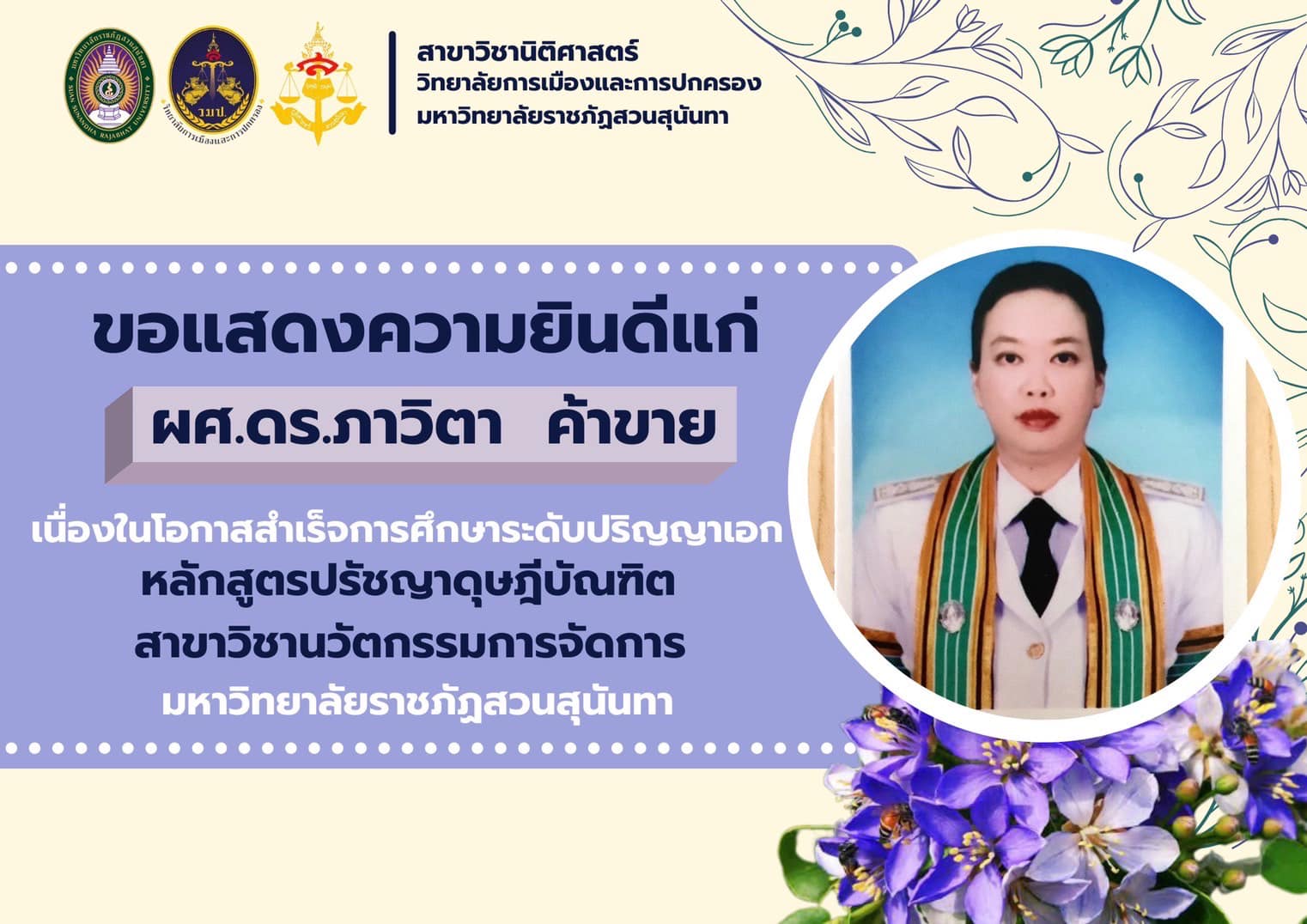 ขอแสดงความยินดีกับ ผศ.ดร.ภาวิตา ค้าขาย เนื่องในโอกาสสำเร็จการศึกษาระดับปริญญาเอก หลักสูตรปรัชญาดุษฎีบัณฑิต สาขาวิชานวัตกรรมการจัดการ มหาวิทยาลัยราชภัฏสวนสุนันทา