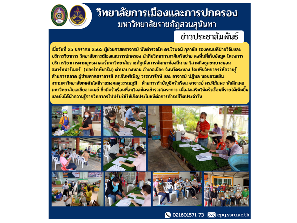 เมื่อวันที่ 25 มกราคม 2565 ผู้ช่วยศาสตราจารย์ พันตำรวจโท ดร.ไวพจน์ กุลาชัย รองคณบดีฝ่ายวิจัยและบริการวิชาการ วิทยาลัยการเมืองและการปกครอง นำทีมวิทยากรภาคีเครือข่าย ลงพื้นที่เก็บข้อมูล โครงการบริการวิชาการตามยุทธศาสตร์มหาวิทยาลัยราชภัฏเพื่อการพัฒนาท้องถิ่น ณ วิสาหกิจชุมชนบางนอน สมาร์ทฟาร์เมอร์ (ปองรักษ์ฟาร์ม) ตำบลบางนอน อำเภอเมือง จังหวัดระนอง โดยทีมวิทยากรให้ความรู้ ด้านการตลาด ผู้ช่วยศาสตราจารย์ ดร.จันทร์เพ็ญ วรรณารักษ์ และ อาจารย์ ปฏิพล หอมยามเย็น จากมหาวิทยาลัยเทคโนโลยีราชมงคลสุวรรณภูมิ ด้านการทำบัญชีครัวเรือน อาจารย์ ดร.ทิฆัมพร พันลึกเดช มหาวิทยาลัยเอเชียอาคเนย์ ซึ่งมีครัวเรือนที่สนใจสมัครเข้าร่วมโครงการ เพื่อส่งเสริมให้ครัวเรือนมีรายได้เพิ่มขึ้น และยังได้นำความรู้จากวิทยากรไปปรับใช้ให้เกิดประโยชน์ต่อการดำรงชีวิตประจำวัน