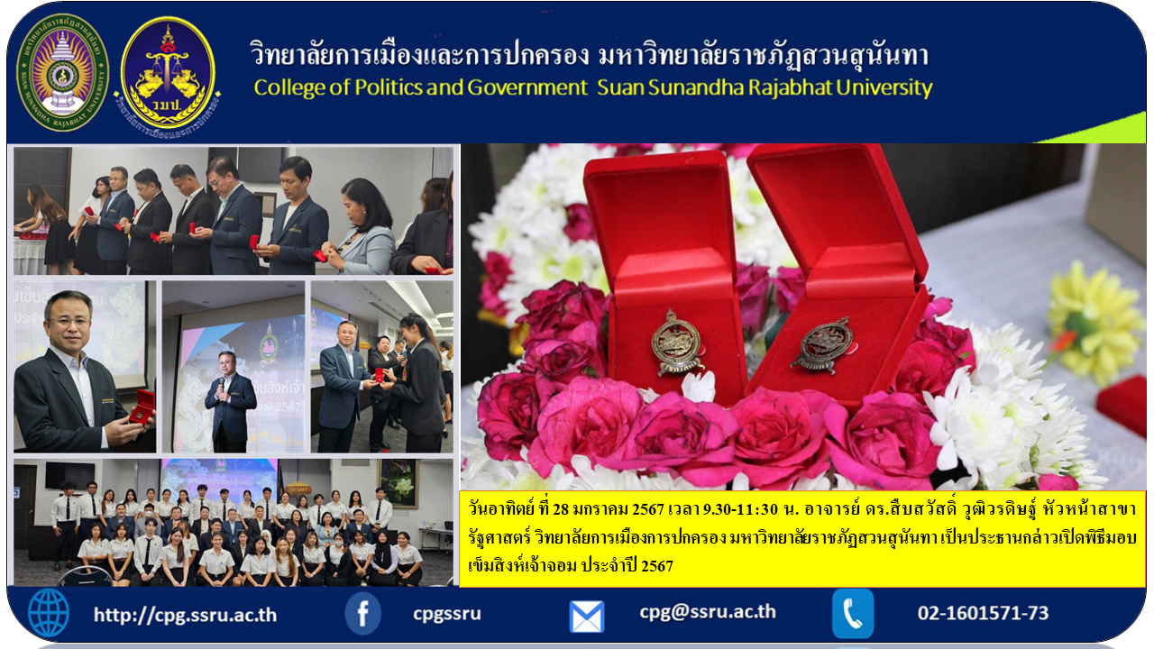 วันอาทิตย์ ที่ 28 มกราคม 2567 เวลา 9.30-11:30 น. อาจารย์ ดร.สืบสวัสดิ์ วุฒิวรดิษฐ์ หัวหน้าสาขารัฐศาสตร์ วิทยาลัยการเมืองการปกครอง มหาวิทยาลัยราชภัฏสวนสุนันทา เป็นประธานกล่าวเปิดเพิดพิธีมอบเข็มสิงห์เจ้าจอม ประจำปี 2567
