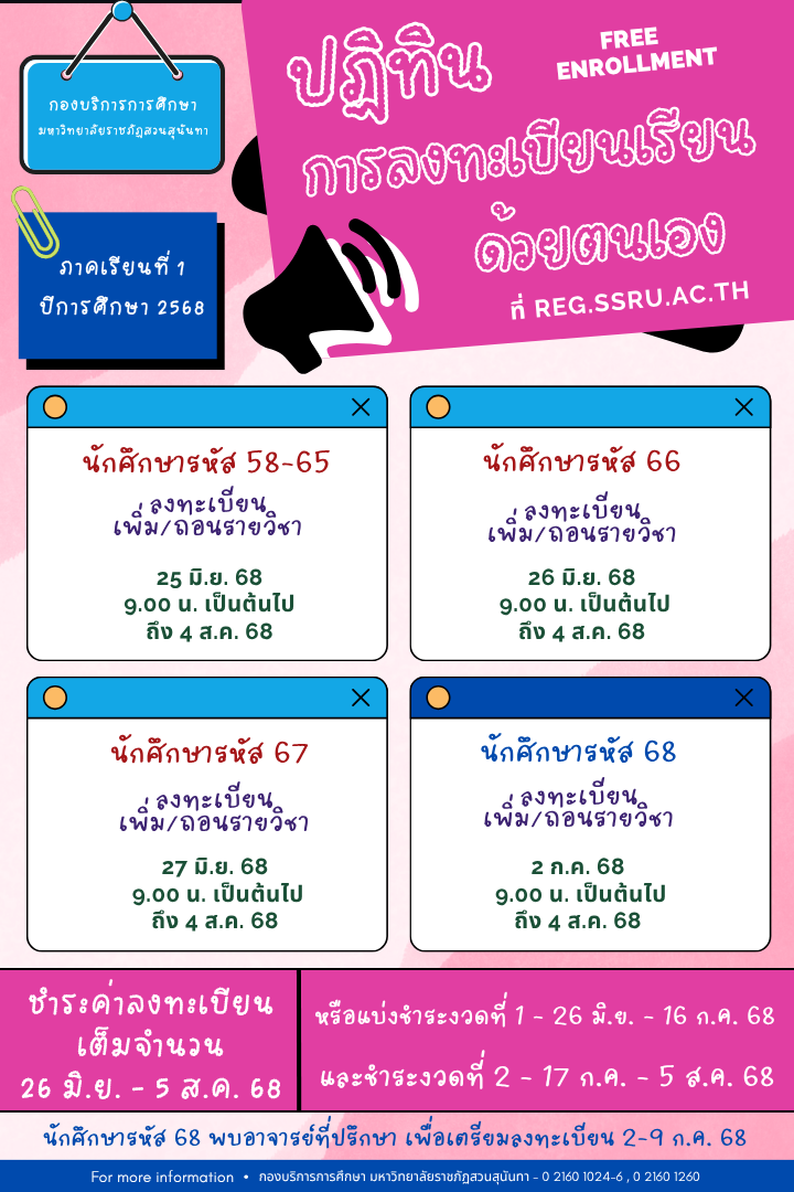 ตารางลงทะเบียนเรียนภาคเรียนที่ 1 ปีการศึกษา 2568 (ภาคปกติ)